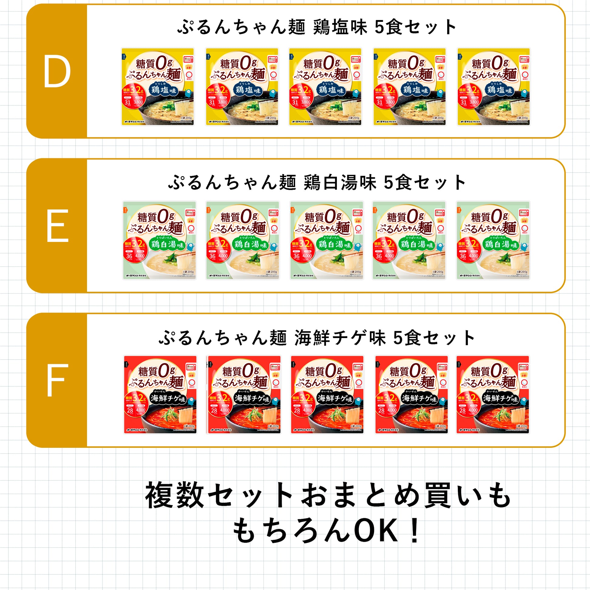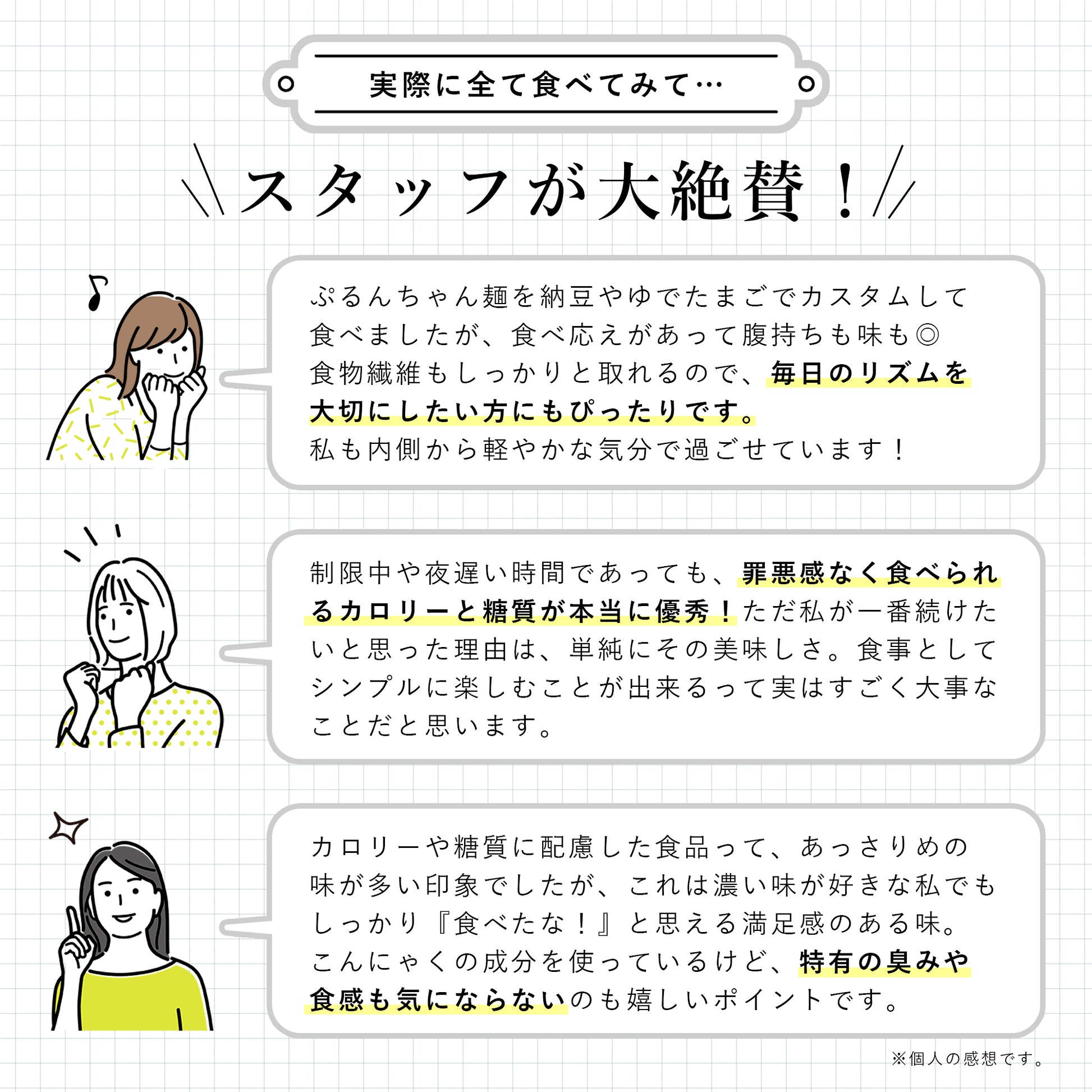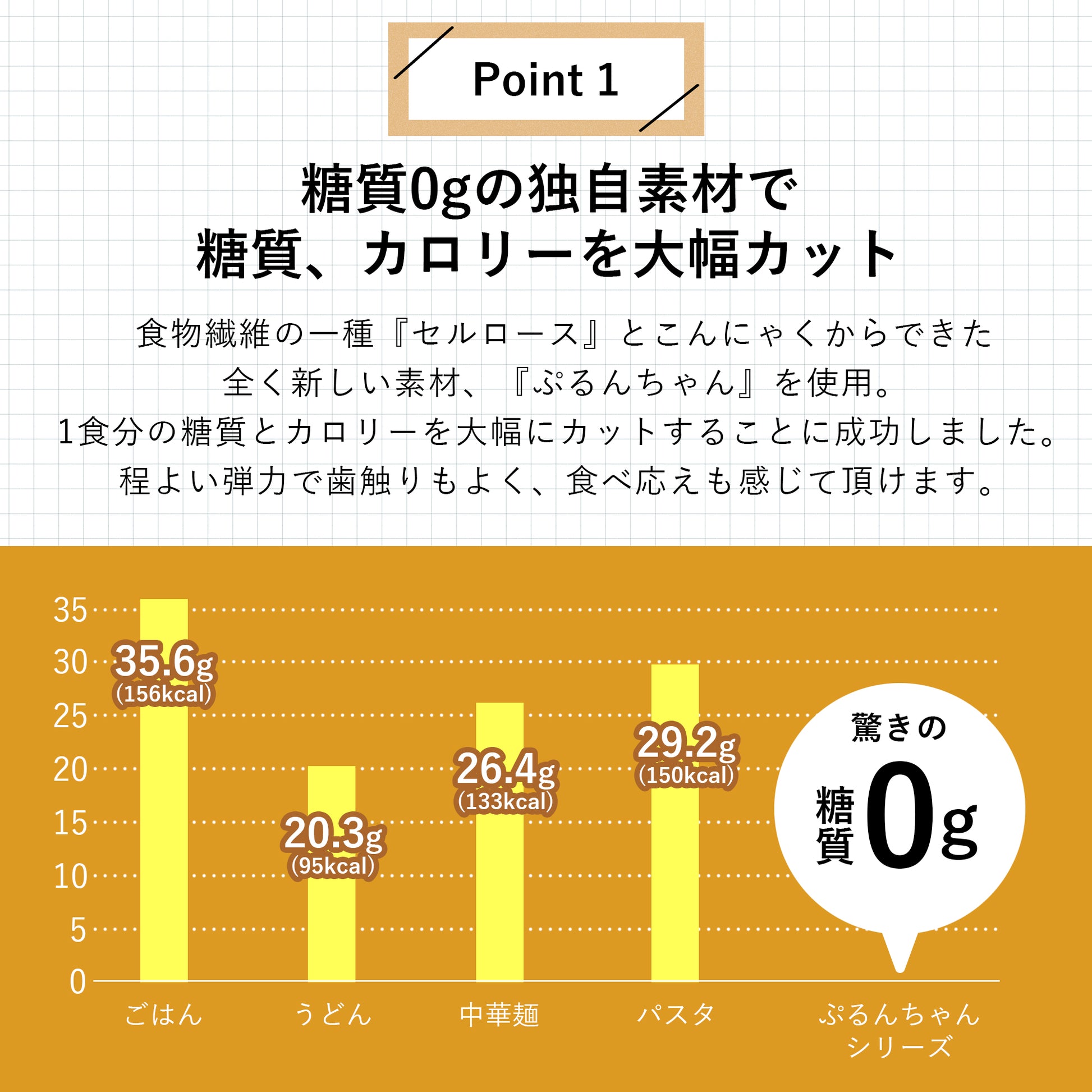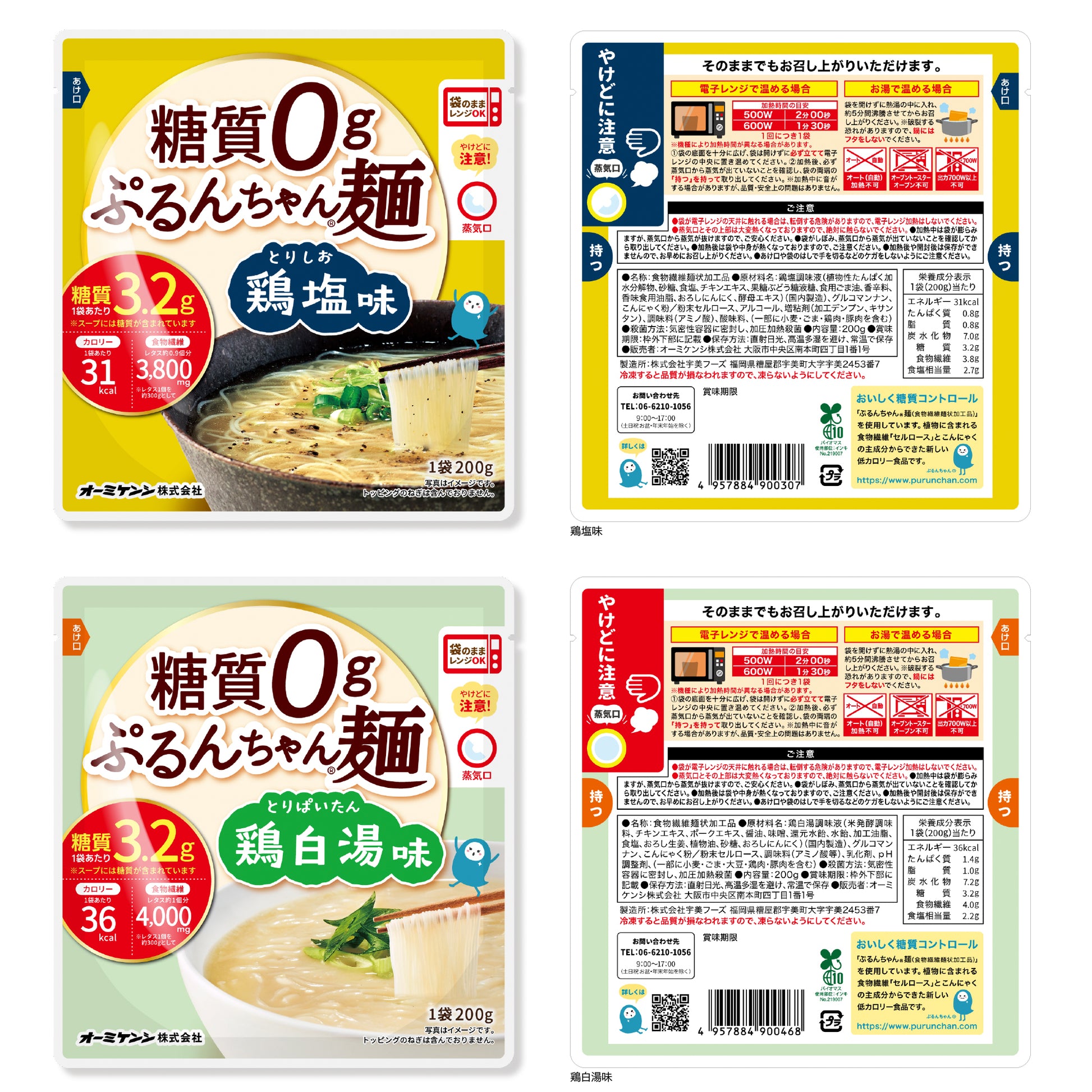 ●糖質0gぷるんちゃん麺鶏塩味:鶏塩調味液(植物性たんぱく加水分解物、砂糖、食塩、チキンエキス、果糖ぶどう糖液糖、食用ごま油、香辛料、香味食用油脂、おろしにんにく、酵母エキス)(国内製造)、グルコマンナン、こんにゃく粉/粉末セルロース、アルコール、増粘剤(加工デンプン、キサンタン)、調味料(アミノ酸)、酸味料、(一部に小麦・ごま・鶏肉・豚肉を含む)