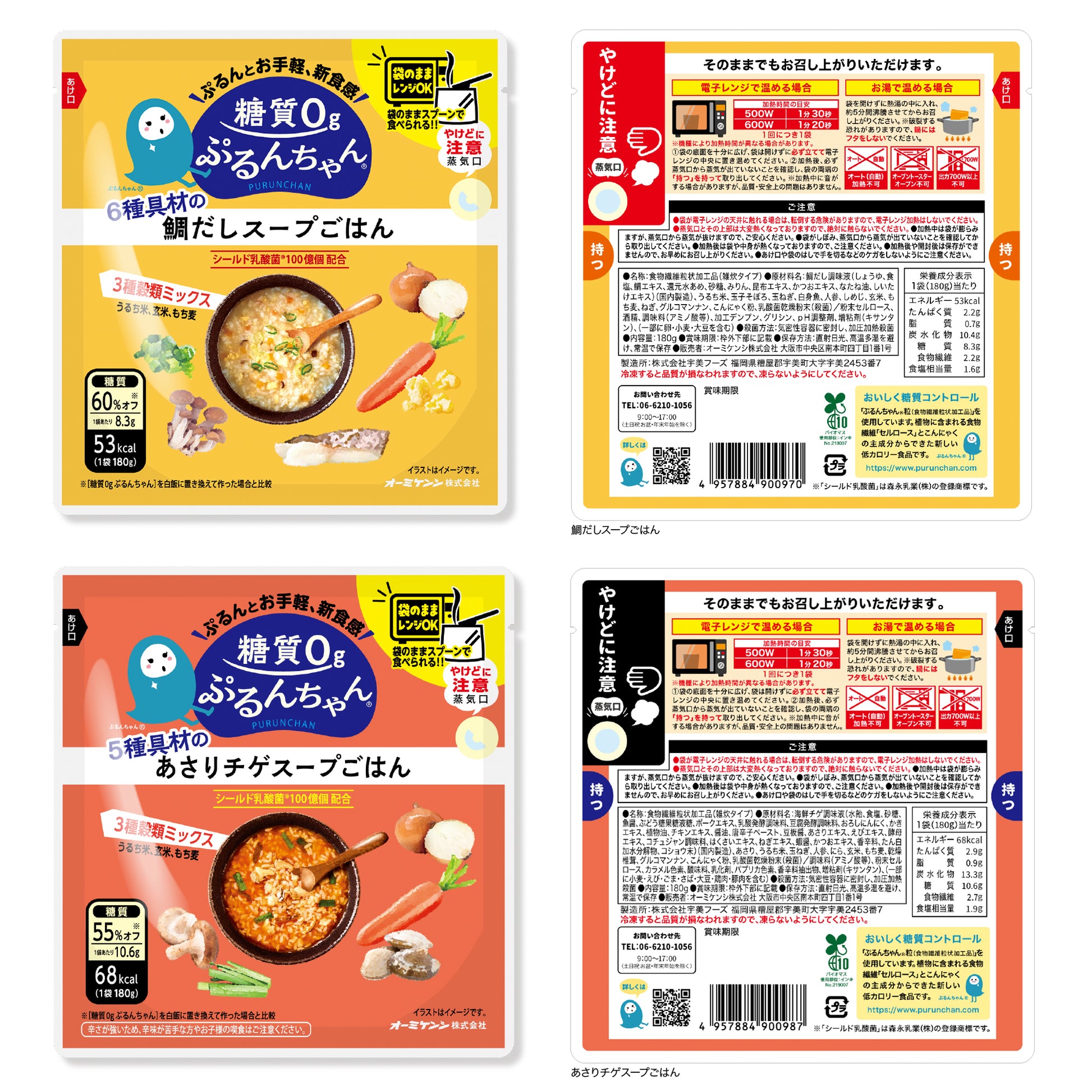 ●ぷるんちゃん6種具材の鯛だしスープごはん:鯛だし調味液(しょうゆ、食塩、鯛エキス、還元水あめ、砂糖、みりん、昆布エキス、かつおエキス、なたね油、しいたけエキス)(国内製造)、うるち米、玉子そぼろ、玉ねぎ、白身魚、人参、しめじ、玄米、もち麦、ねぎ、グルコマンナン、こんにゃく粉、乳酸菌乾燥粉末(殺菌)/粉末セルロース、酒精、調味料(アミノ酸等)、加工デンプン、グリシン、pH調整剤、増粘剤(キサンタン)、(一部に卵・小麦・大豆を含む)