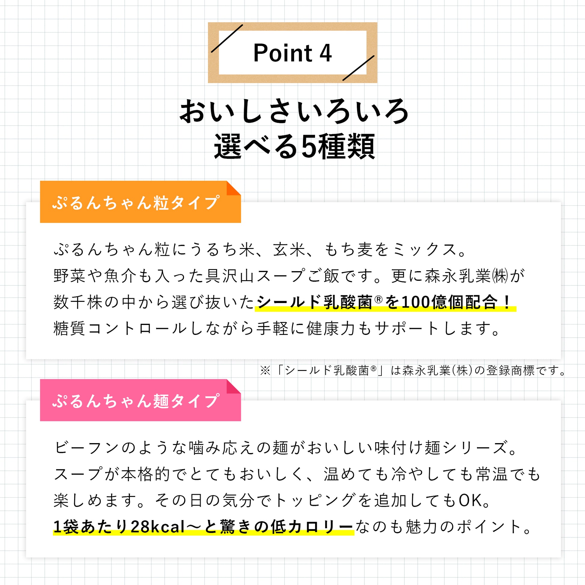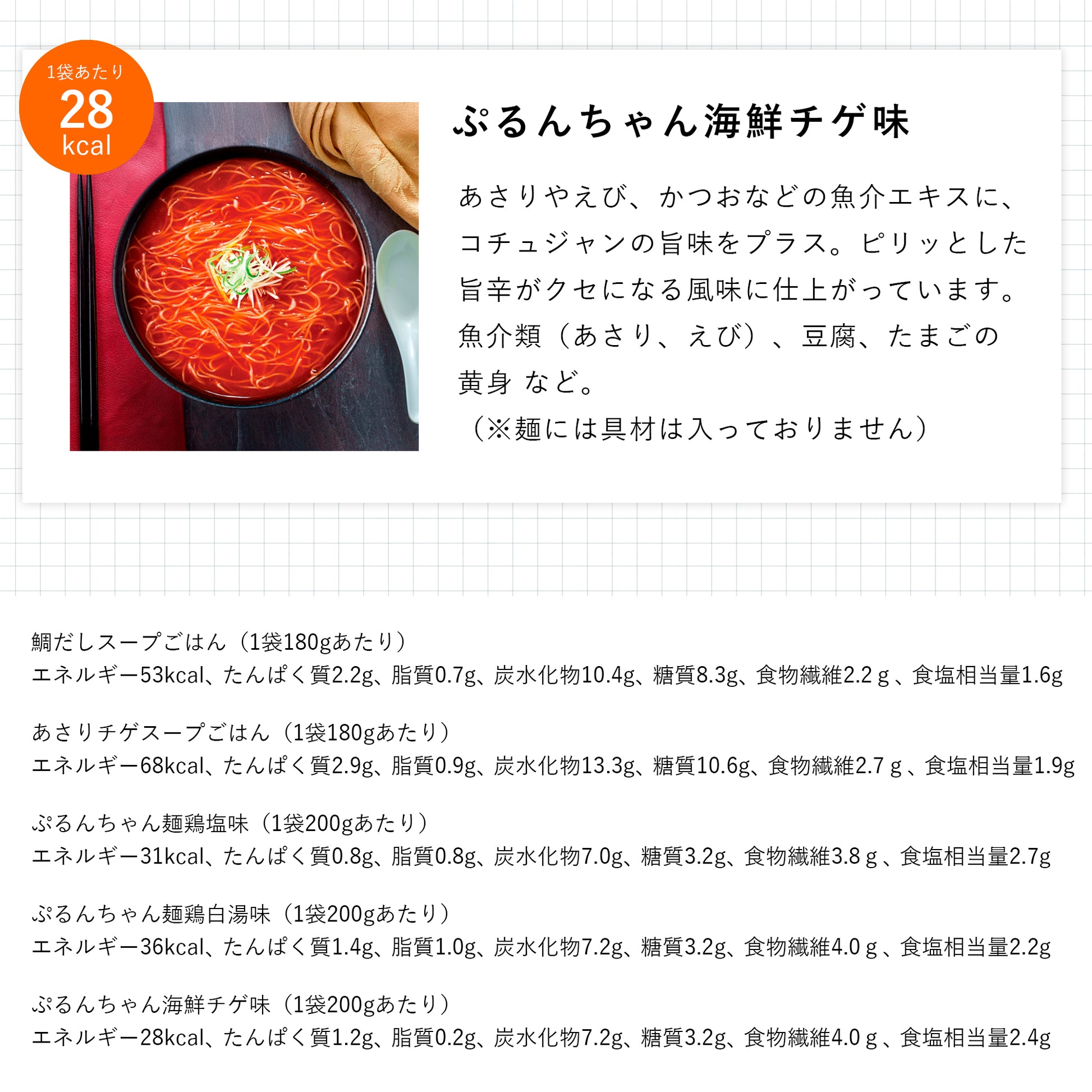 ぷるんちゃん6種具材の鯛だしスープごはん/ぷるんちゃん5種具材のあさりチゲスープごはん/糖質0gぷるんちゃん麺鶏塩味/糖質0gぷるんちゃん麺鶏白湯味/糖質0gぷるんちゃん麺海鮮チゲ味